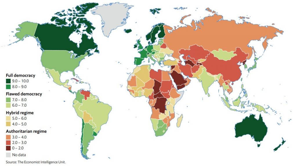 According to the EIU, this decline in the average score in the global scale was due to the severe regression in the state of democracy in the regions of Latin America and Sub-saharan Africa.