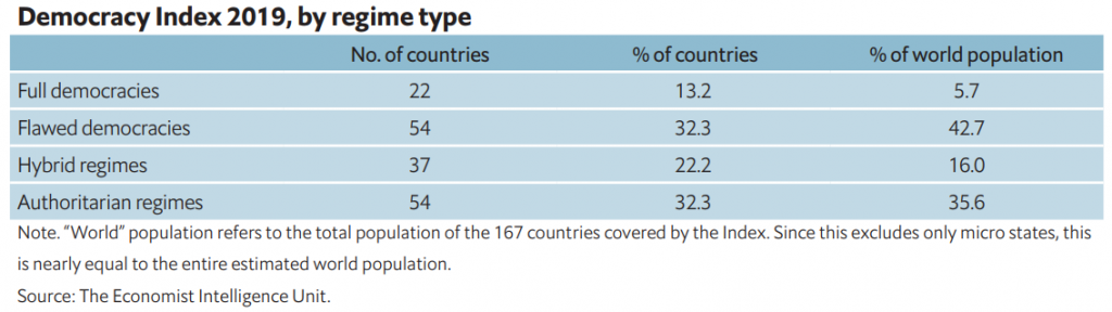 167 countries were included in this year’s study. 48.4% of these are democracies, 35.6% are authoritarian regimes, while the remaining 16% are hybrid regimes.